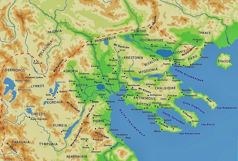 Nu doar etruscii au influențat cu elemente tracice spațiul egeean. Dacă ne referim la zona Greciei antice, trebuie să spunem că și alte areale, precum Macedonia, cu mult înainte de afirmarea politică a regatului macedonean, erau dominate etnic și cultural de neamuri tracice. Aici regăsim provincia antică ce era cunoscută sub numele de Edonia (sau Mygdonia), localizată între râurile Nestus și Strymon, în estul peninsulei Halkidiki, locuită de edoni, neam tracic.